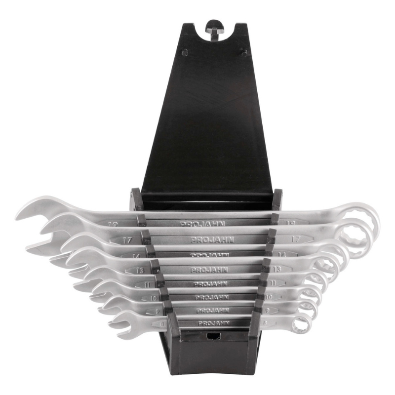 Zestaw 8 kluczy oczkowo-płaskich w najczęściej stosowanych rozmiarach, umieszczony w praktycznym uchwycie typu clip.