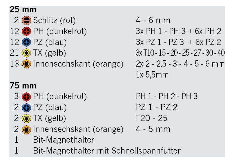 Profesjonalny zestaw bitów w kompaktowej i wytrzymałej plastikowej walizce z przezroczystą pokrywą. Zawiera 71 elementów, w tym bity o długości 25 mm i 75 mm. Zawartość dostosowana do potrzeb użytkowników profesjonalnych.