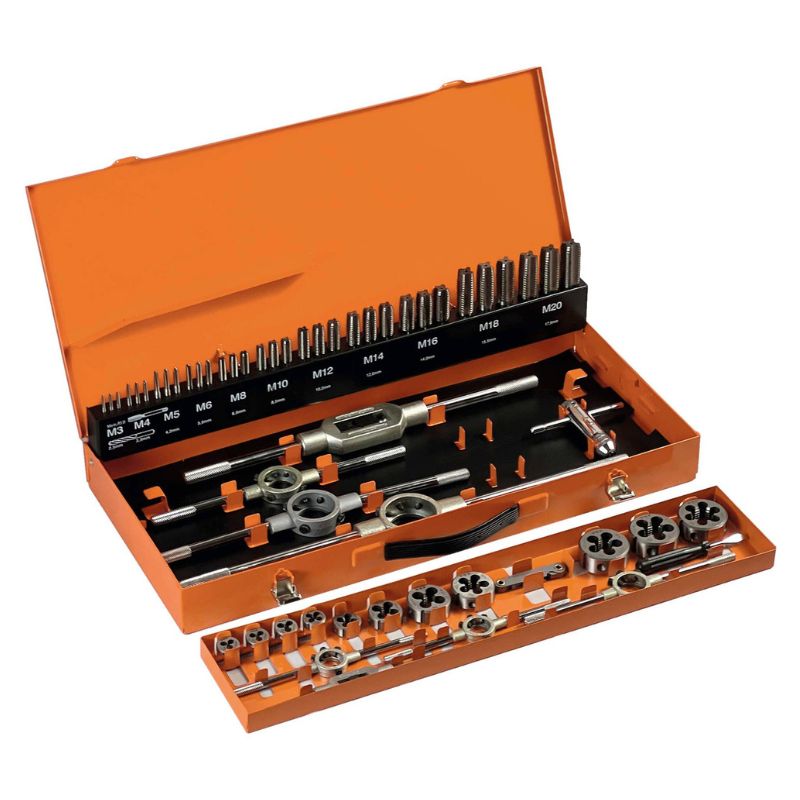 Profesjonalny zestaw do ręcznego wykonywania gwintów metrycznych wewnętrznych i zewnętrznych w zakresie M3 do M20. Zestaw przechowywany w solidnej metalowej walizce, idealny do warsztatów, serwisów i zastosowań przemysłowych. Narzędzia wykonane z wysokiej jakości stali szybkotnącej (HSS-G), zgodnie z normami DIN.