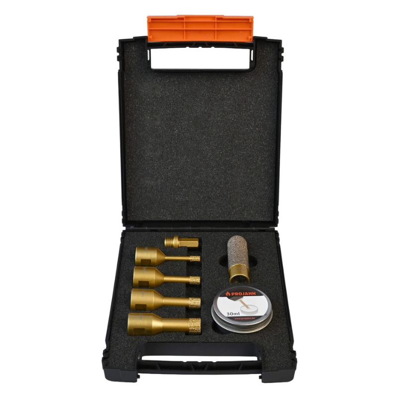 Zestaw wierteł diamentowych M14 – samoczynne chłodzenie (Ø 6–14 mm) z frezem diamentowym Ø 20 mm, adapterem 6-kąt oraz woskiem chłodzącym.