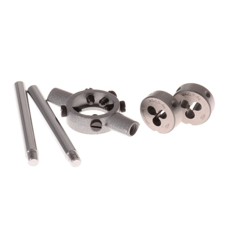 Zestaw wysokiej jakości narzynek HSS-G do nacinania gwintów zewnętrznych w jednym etapie. Wszystkie narzynki mają średnicę zewnętrzną 25 mm, dzięki czemu wymagany jest tylko jeden uchwyt dla rozmiarów M3 - M12. Narzynki charakteryzują się wysoką wydajnością cięcia i trwałością. Uchwyt do narzynek wykonany jest z odlewu ciśnieniowego cynku i posiada 5 śrub mocujących dla stabilnego zamocowania narzynki.