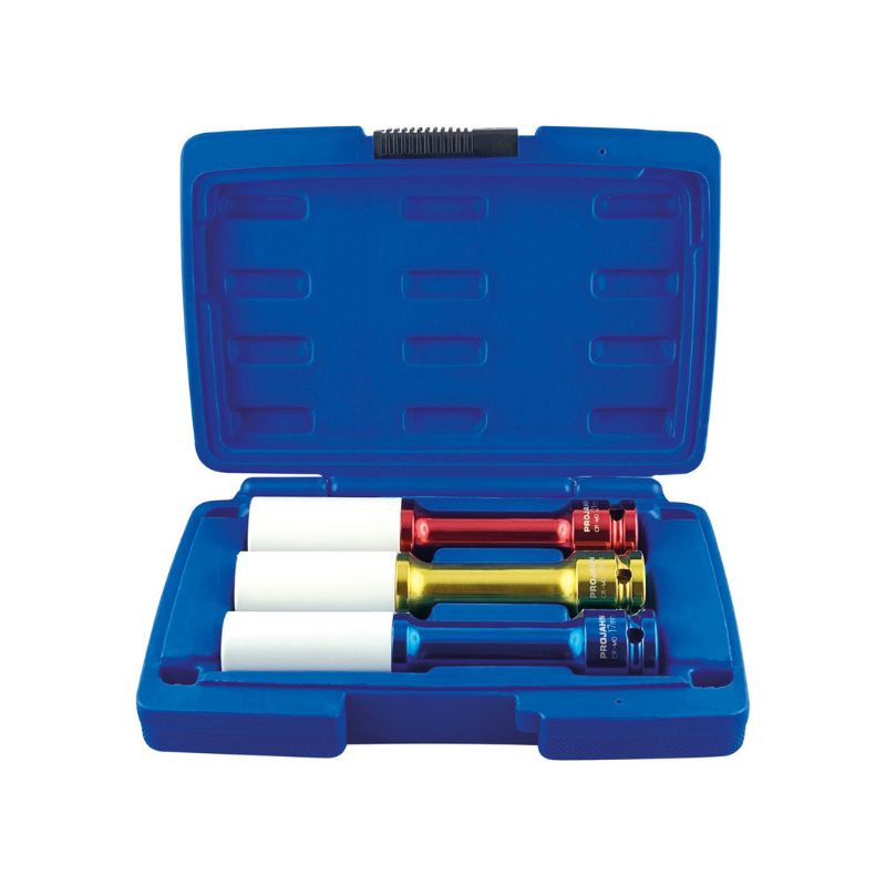 Zestaw bardzo głębokich nasadek udarowych 1/2" do felg aluminiowych - pokryte tworzywem sztucznym, aby nie uszkodzić felg aluminiowych. Wykonane ze specjalnej stali chromowo-wanadowo-molibdenowej (CrMoV), dzięki czemu nadają się do wymagających zastosowań z wkrętakami pneumatycznymi. Długa konstrukcja do ciasnych miejsc pracy lub większej swobody ruchu podczas pracy z kluczem dynamometrycznym.
