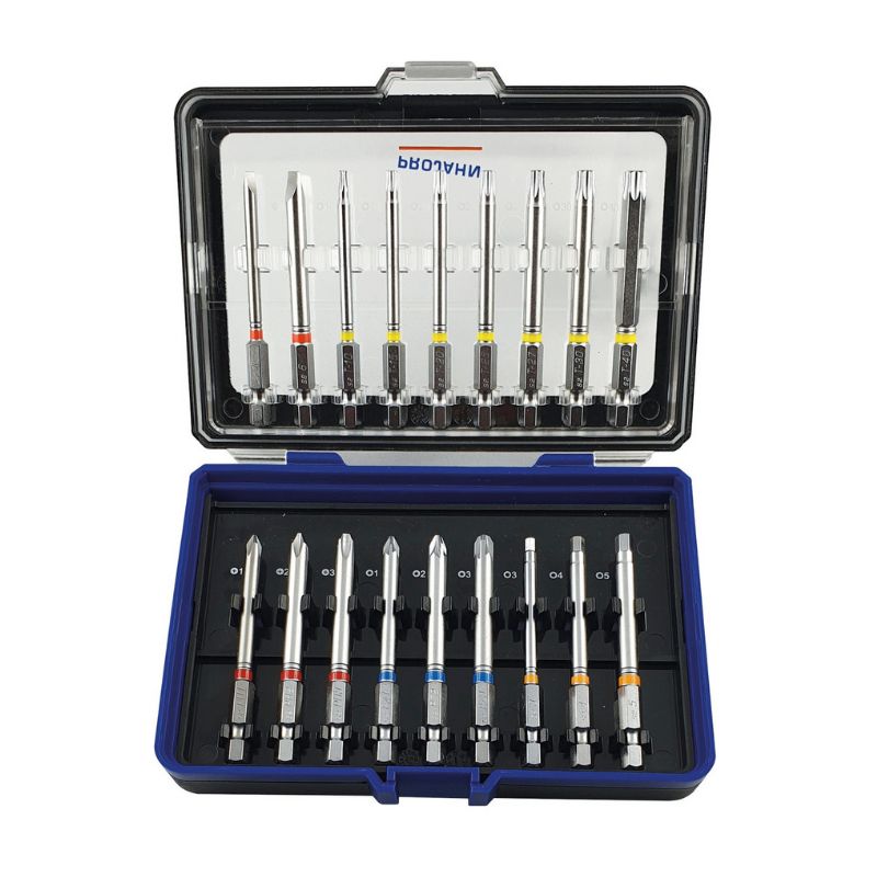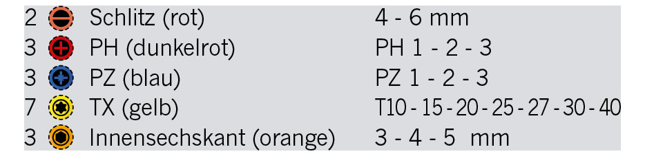 Skrzynka na bity z długimi bitami 75 mm. Bity wykonane z wysokiej jakości stali specjalnej S2, idealne dla profesjonalnych użytkowników. Wyższa precyzja dopasowania i specjalne hartowanie – długa żywotność i wysoka jakość połączenia śrubowego. Kolorowe oznaczenia bitów ułatwiają znalezienie odpowiedniego bitu.