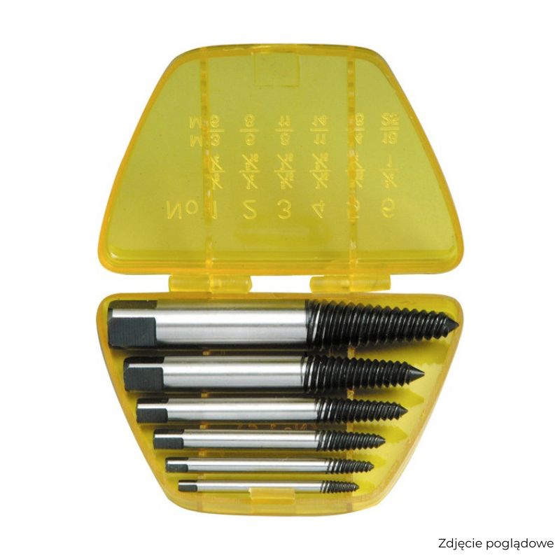 Zdjęcie poglądoweWykrętaki do usuwania zerwanych śrub i nakrętek. W plastikowym pudełku z uchylną przezroczystą pokrywą. Do śrub od M3 do M24.