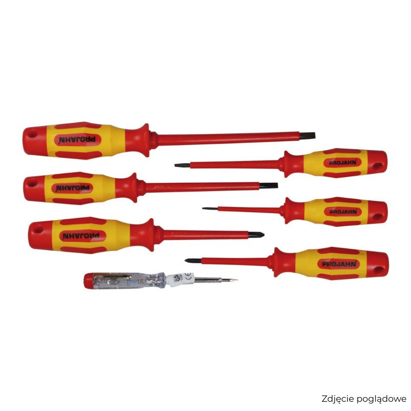 Zdjęcie poglądoweProfesjonalny zestaw 7 izolowanych wkrętaków VDE przeznaczonych do pracy pod napięciem do 1000 V. W skład zestawu wchodzą narzędzia do śrub z nacięciem prostym oraz krzyżakowym typu PH. Idealny wybór dla elektryków i specjalistów wymagających maksymalnego bezpieczeństwa i precyzji.