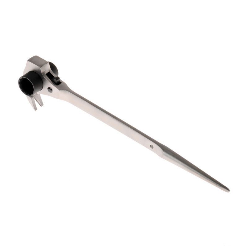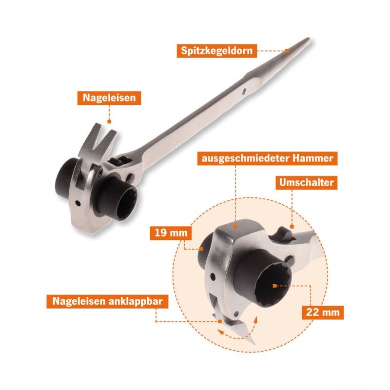 Klucz do rusztowań 4 w 1 – wszechstronny z 4 funkcjami: 1. Kuty młotek, 2. Składany wyciągacz gwoździ do szybkiego usuwania starych gwoździ i śrub, 3. Grzechotka dwukierunkowa – szybsza obróbka śrub i nakrętek, 4. Trzpień stożkowy ze spiczastym ostrzem do szybkiej regulacji elementów. Rozmiary 19 i 22 mm lub 17 i 19 mm w jednym kluczu. Trwały dzięki solidnej konstrukcji. Większa wszechstronność dzięki uniwersalnemu zastosowaniu. Rzadsza wymiana narzędzi dzięki większej liczbie funkcji. Z przełącznikiem do szybkiej zmiany kierunku grzechotki.