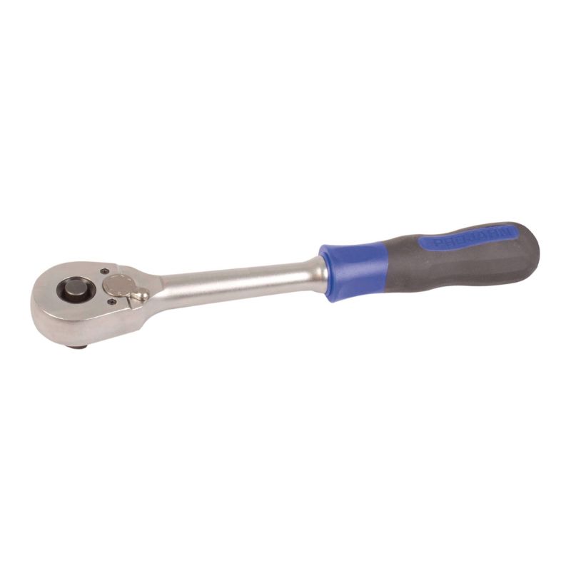 Zdjęcie poglądoweIdealne narzędzie do pracy w ciasnych przestrzeniach, np. przy układach wydechowych, siłownikach, systemach ogrzewania i klimatyzacji, automatycznych skrzyniach biegów i wielu innych. Niezwykle lekka praca grzechotki poprzez obrót dwukomponentowej rękojeści. Może być również używana jako „zwykła” grzechotka z drobnymi zębami. Dodatkowo, posiada solidny, kwadratowy napęd 6,3 [1/4"] na końcu rękojeści do mocowania przedłużki lub łącznika T. Przełączanie z obrotów do przodu na wsteczny poprzez przesunięcie kwadratowego napędu na drugą stronę. Grzechotka z ergonomiczną, dwukomponentową rękojeścią zapewnia pewny chwyt i pracę bez zmęczenia.
