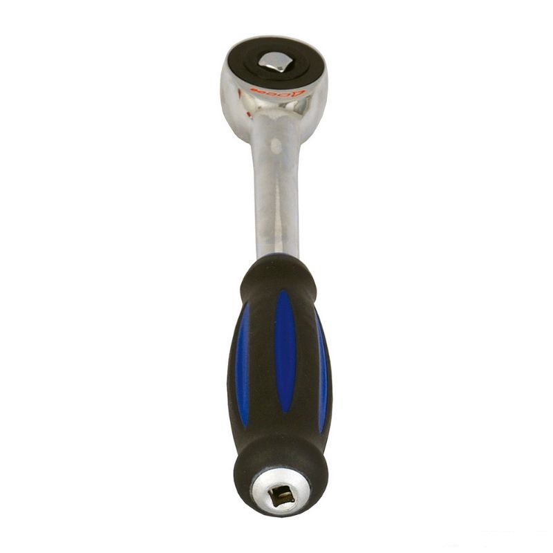 Przełączanie z obrotów do przodu na wsteczny poprzez przesunięcie kwadratowego napędu na drugą stronę. Grzechotka z ergonomiczną, dwukomponentową rękojeścią zapewnia pewny chwyt i pracę bez zmęczenia.