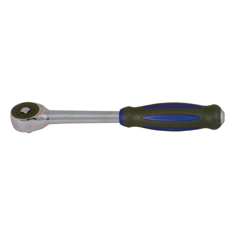 Wysokiej jakości grzechotka ręczna przeznaczona do profesjonalnych zastosowań warsztatowych i serwisowych. Wyposażona w mechanizm zapadkowy umożliwiający pracę z niewielkim zakresem ruchu. Dzięki funkcji szybkiego zwalniania (Quick Release) oraz przełącznikowi kierunku pracy, obsługa jest szybka i wygodna. Grzechotka została wykonana z wytrzymałej stali chromowo-wanadowej i pokryta warstwą polerowanego chromu, co zapewnia odporność na korozję i estetyczny wygląd.
