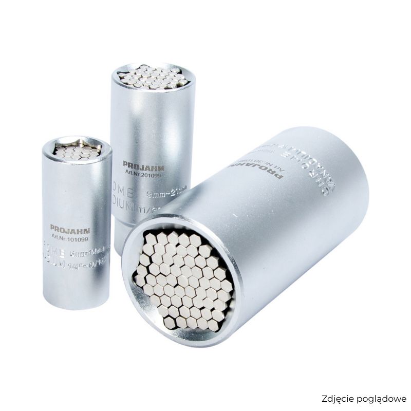 Zdjęcie poglądoweWielofunkcyjne nasadki - można używać jako nasadki, wkrętak do haków, nakrętek motylkowych, TX, kwadratowych i oczkowych. Sprężynowe, sześciokątne sworznie pasują do wielu profili zewnętrznych. Nadaje się do śrub metrycznych i calowych. Alternatywa dla konwencjonalnych zestawów nasadowych, oszczędzająca miejsce, czas i wagę, do użytku mobilnego.
