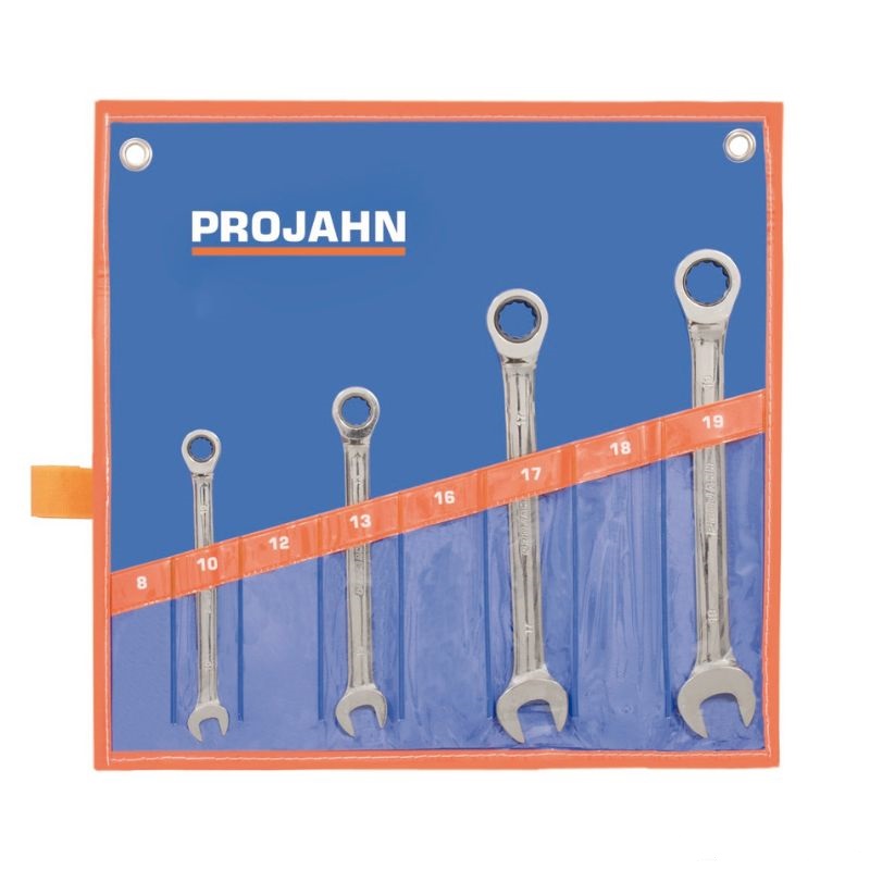 Ten 4-częściowy komplet kluczy płasko-oczkowych z mechanizmem zapadkowym obejmuje najczęściej używane rozmiary (10, 13, 17 i 19 mm). Dzięki precyzyjnej konstrukcji oraz smukłej budowie części oczkowej klucze sprawdzą się nawet w trudno dostępnych miejscach.
