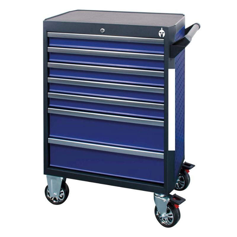 Zdjęcie poglądoweWózek narzędziowy SPACE z 7 szufladami i 229-elementowym zestawem narzędzi Proficraft w kolorze niebieskim/antracytowym z uniwersalnym zestawem narzędzi do 3 szuflad. Z 3 solidnymi, wysokiej jakości grzechotkami z 72 zębami i drobnym posuwem. W zestawie nasadki udarowe do felg aluminiowych i pudełko z bitami.