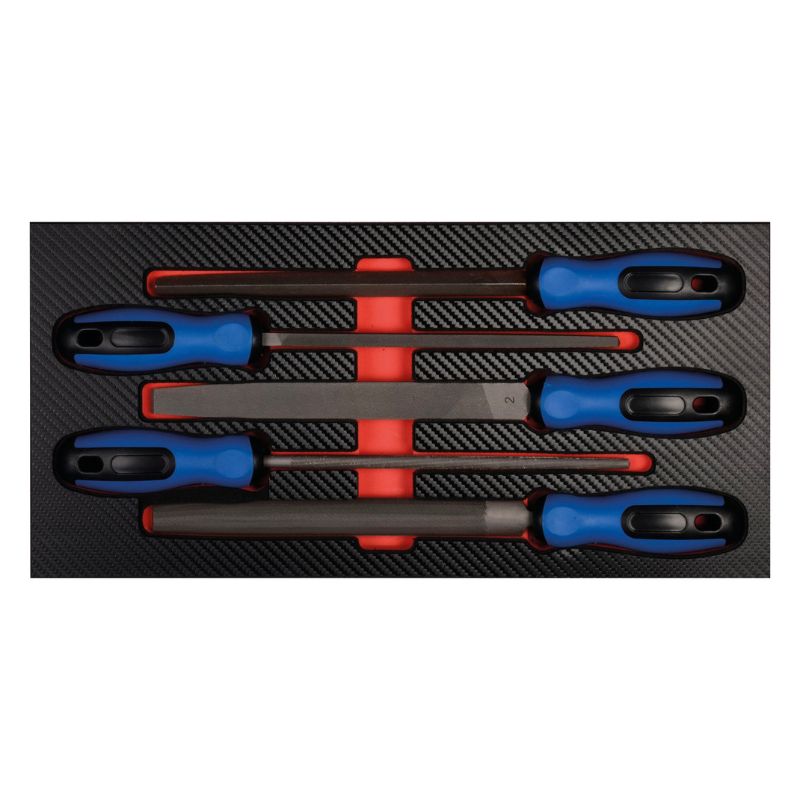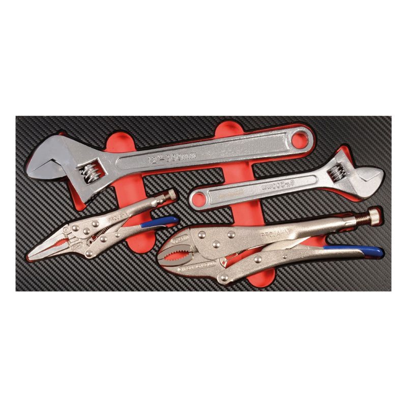 Profesjonalny zestaw narzędzi do wózka warsztatowego z 4 szufladami, składający się ze 188 wysokiej jakości elementów. Idealny do kompleksowego wyposażenia warsztatu, serwisu lub garażu. Zawiera szeroki wybór kluczy, nasadek, grzechotek, wkrętaków, szczypiec, pilników i młotków, a także narzędzia specjalistyczne jak klucze nastawne, imbusy, nasadki TX i wiele innych. Wszystkie narzędzia są umieszczone w ergonomicznych wkładach, dopasowanych do szuflad wózka, co gwarantuje porządek, wygodę i szybki dostęp do każdego elementu.