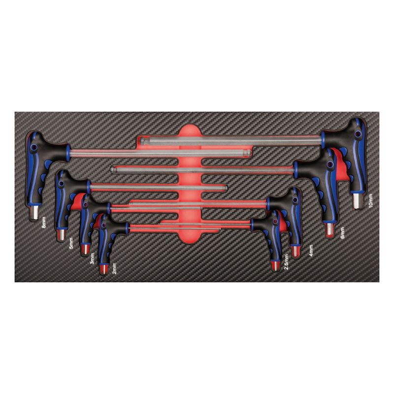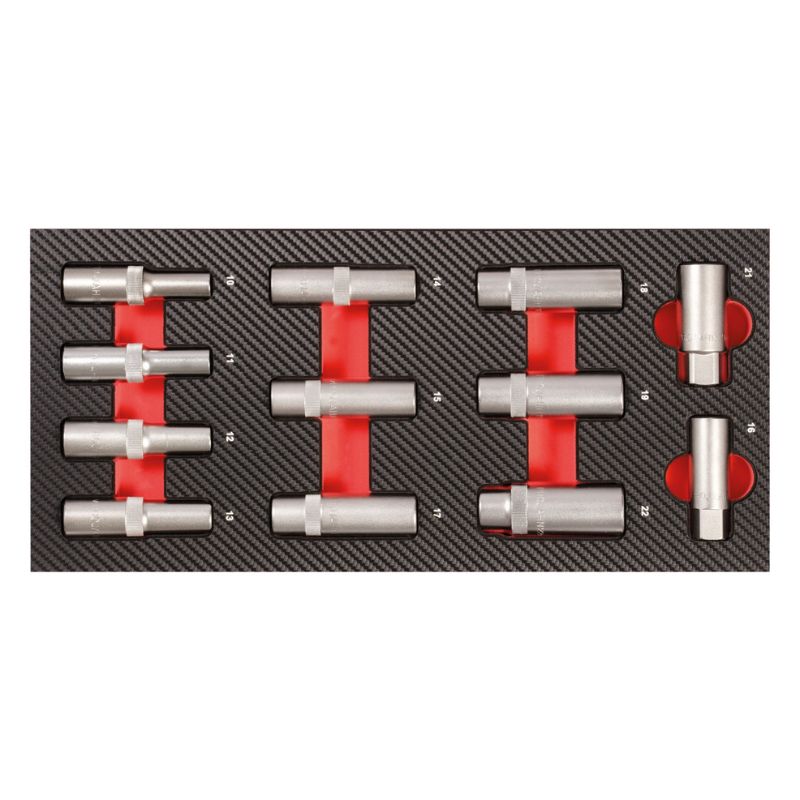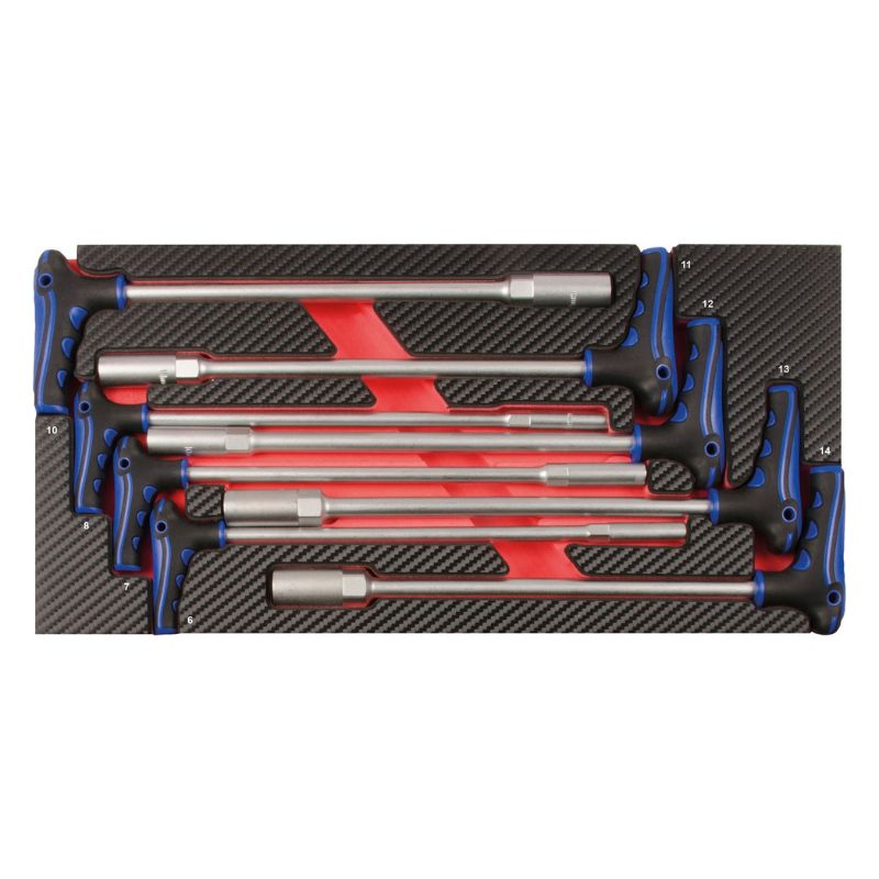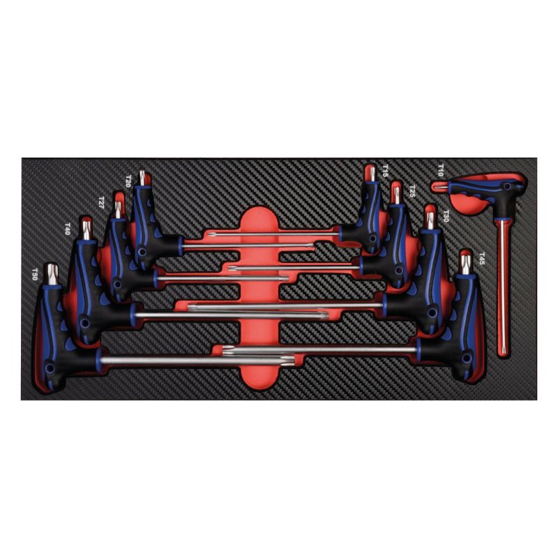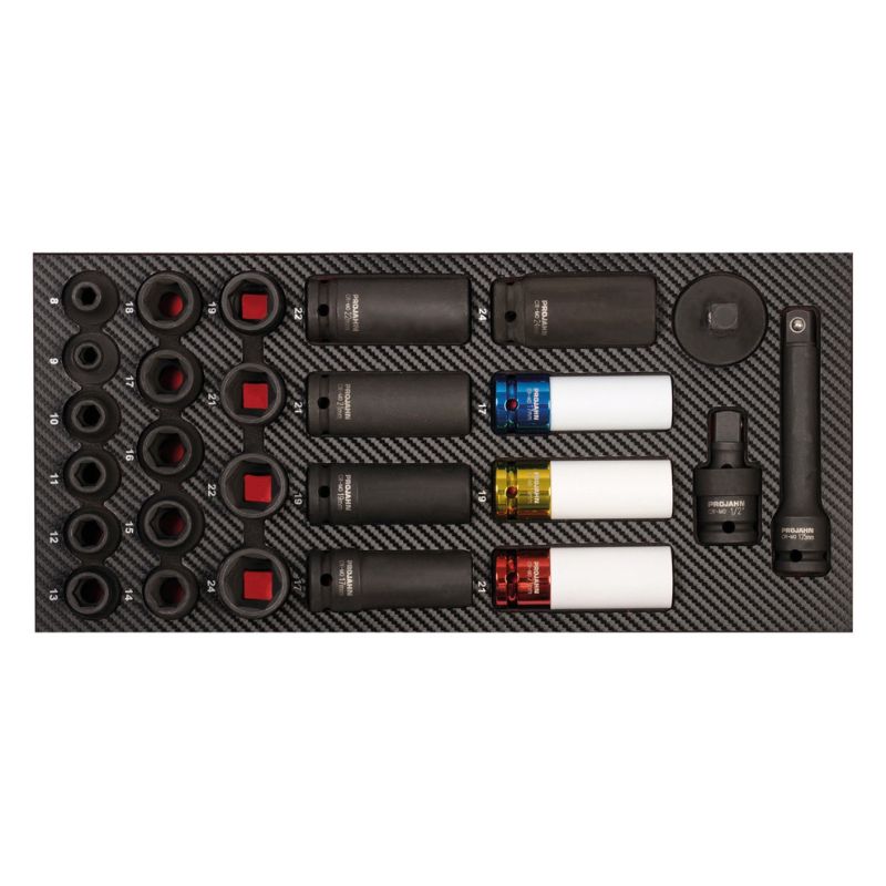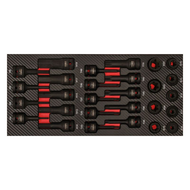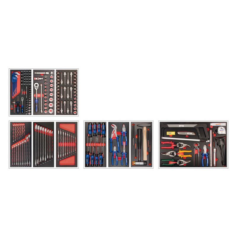 Kompletny, profesjonalny zestaw narzędzi do 8 szuflad – 379 elementów, przeznaczony do wózka warsztatowego GALAXY wraz z nadstawką. To najwyższej klasy wyposażenie warsztatowe dla wymagających użytkowników – mechaników, techników serwisowych i majsterkowiczów premium. Zestaw wykonany jest z trwałej pianki EVA o wysokiej gęstości, z powierzchnią z tworzywa w stylu carbon finish, co zapewnia odporność na zużycie i elegancki wygląd. Każde narzędzie ma swoje miejsce w dokładnie dopasowanej wkładce PROFORM, co gwarantuje porządek, przejrzystość i bezpieczeństwo podczas pracy.