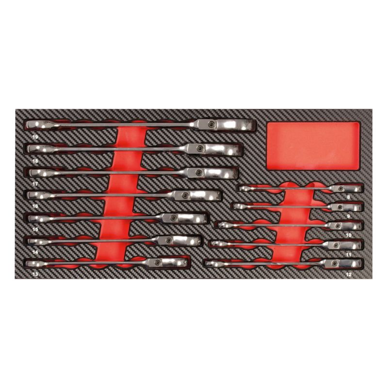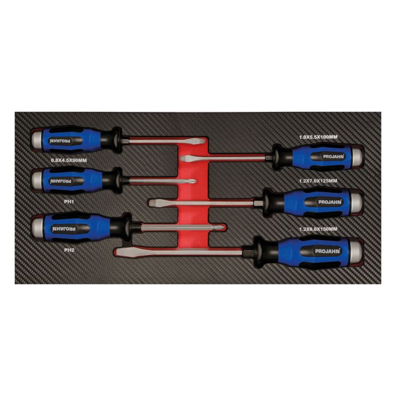 Profesjonalny zestaw 4 szczypiec do pierścieni osadczych (Seeger) w praktycznej wkładce do wózka warsztatowego PROJAHN. Idealny wybór dla mechaników i techników wymagających najwyższej precyzji oraz trwałości narzędzi. Wkładka wykonana z wytrzymałej pianki EVA z trwałą powierzchnią z tworzywa sztucznego w ekskluzywnym wykończeniu carbon finish. Takie połączenie zapewnia wysoką odporność na uszkodzenia, elegancki wygląd oraz łatwość utrzymania czystości. Każde narzędzie ma swoje miejsce i jest czytelnie opisane, co ułatwia organizację pracy oraz szybkie odnalezienie właściwych szczypiec. Moduł stanowi 1/3 standardowej wkładki, dzięki czemu doskonale pasuje do wszystkich wózków warsztatowych PROJAHN.