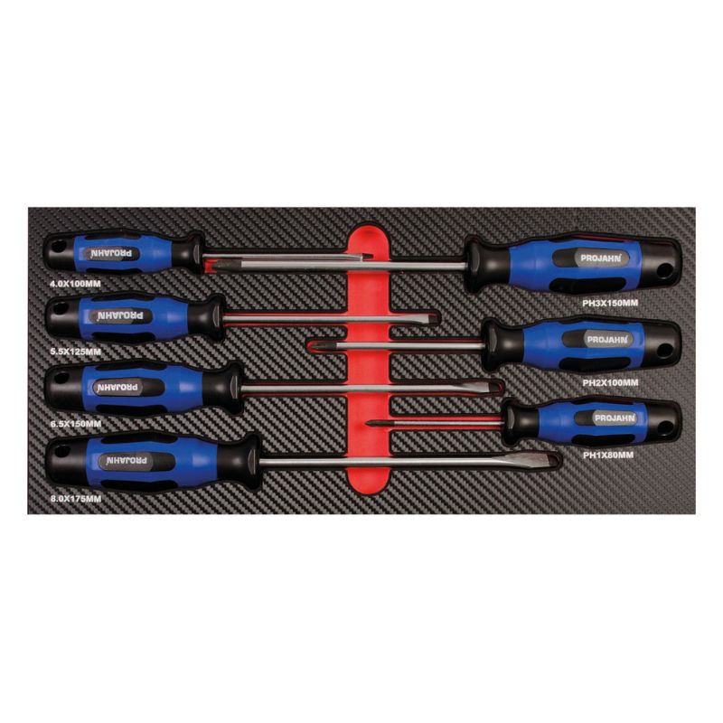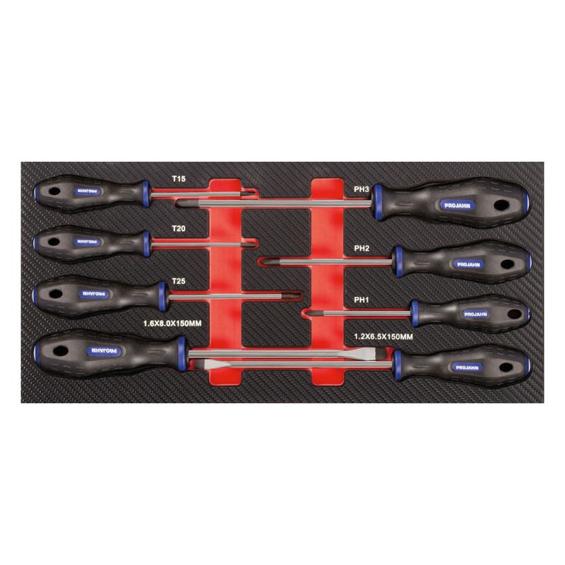 Czytelne oznaczenia narzędzi umożliwiają szybkie odnalezienie potrzebnego elementu, a narzędzia są bezpiecznie i przejrzyście ułożone. Moduł 1/3 zapewnia kompatybilność ze wszystkimi wózkami warsztatowymi PROJAHN.