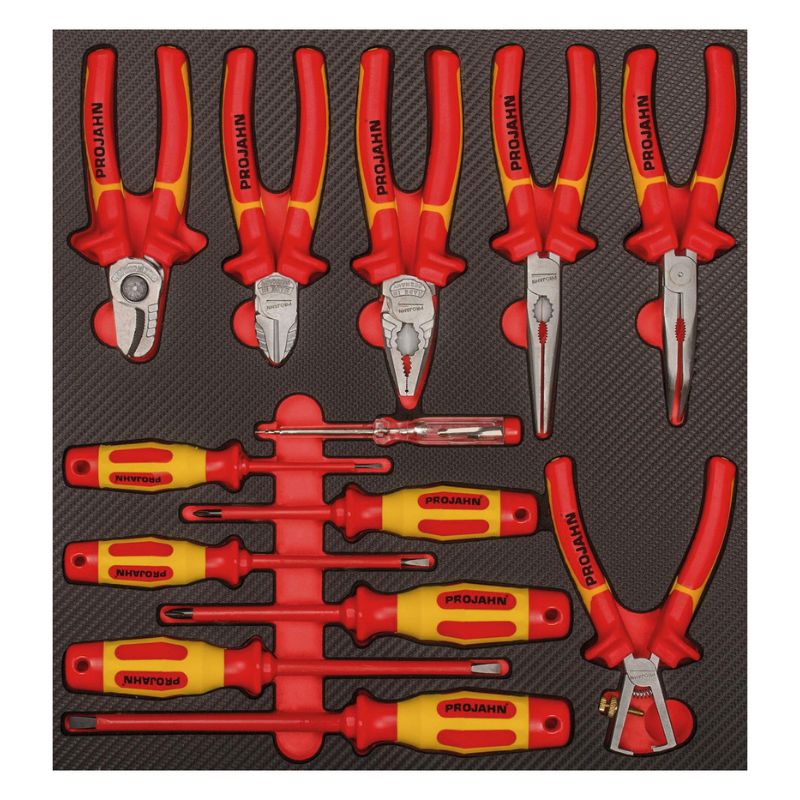 Profesjonalna wkładka warsztatowa z izolowanymi narzędziami VDE, przetestowanymi zgodnie z normą DIN EN 60900, zapewniająca bezpieczeństwo pracy pod napięciem do 1.000 V.