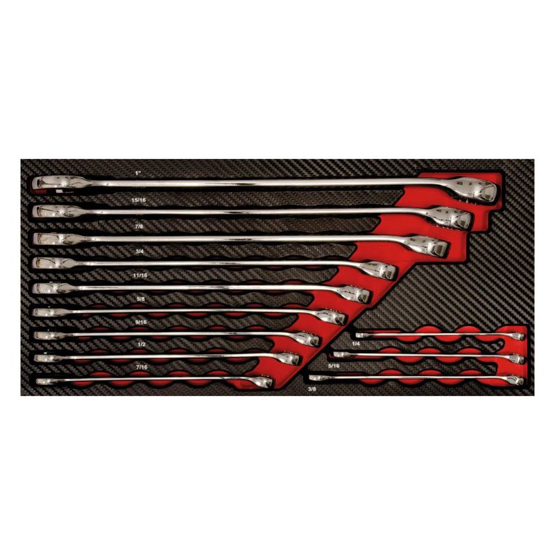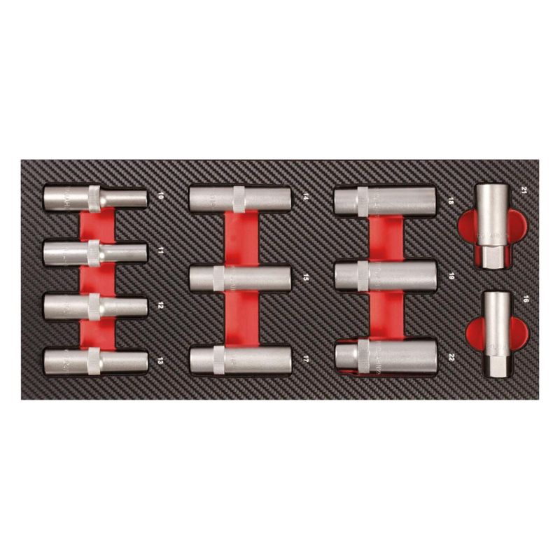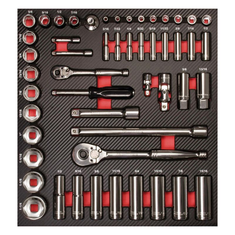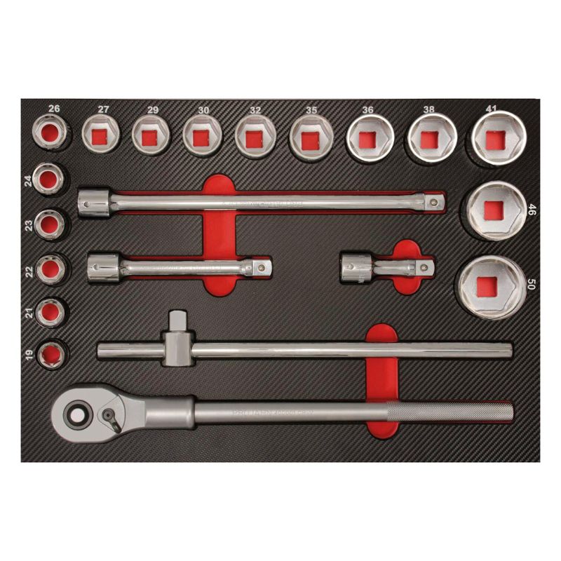Wkład wykonany jest z trwałej pianki EVA pokrytej solidną powierzchnią z tworzywa sztucznego w eleganckim carbon finish, co gwarantuje wysoką odporność na zużycie i zabrudzenia. Wyraźne oznaczenia ułatwiają szybkie odnajdywanie narzędzi i zachowanie porządku w warsztacie.