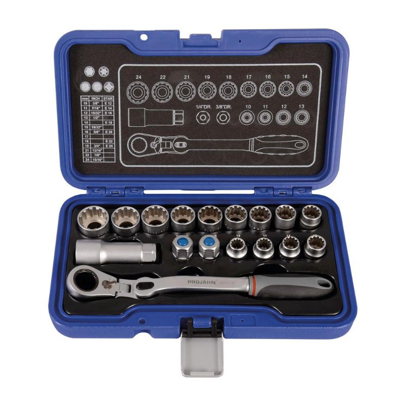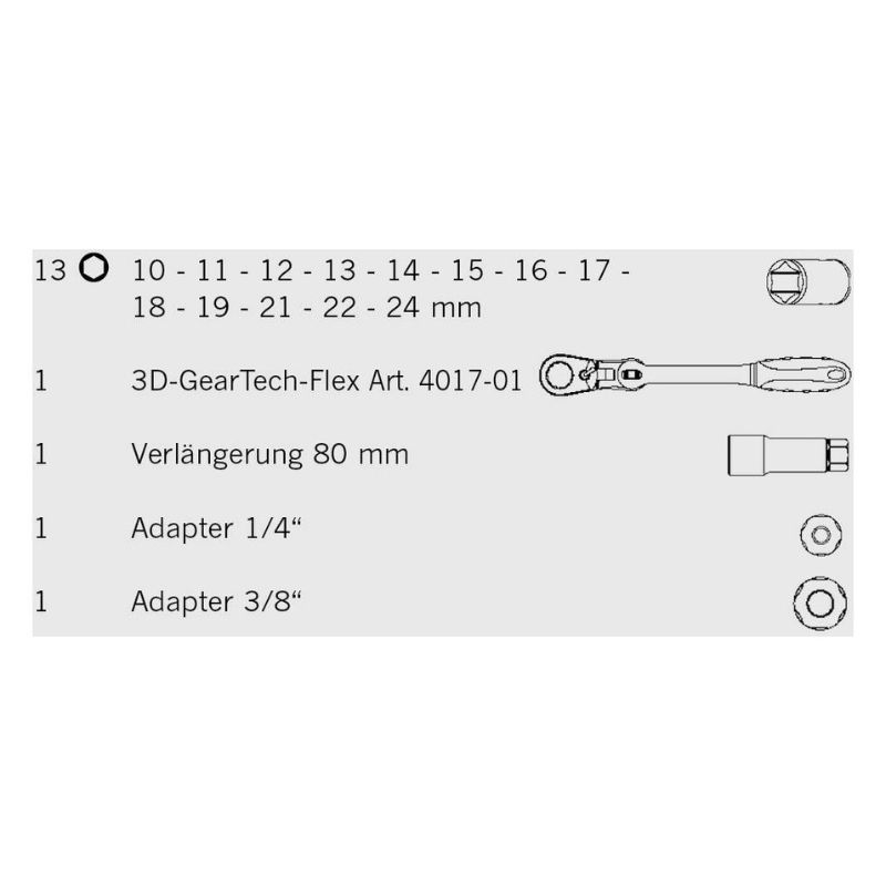 Zestaw wyposażono w grzechotkę 3D GEARTECH-Flex, która umożliwia pracę w trzech wymiarach, co sprawia, że jest idealna do bardzo trudno dostępnych miejsc. Dzięki elastycznym nasadkom przelotowym można stosować zarówno śruby metryczne, calowe, jak i te z profilem TX-E. Adaptery 6,3 mm (1/4") i 10 mm (3/8") pozwalają używać tradycyjnych nasadek.