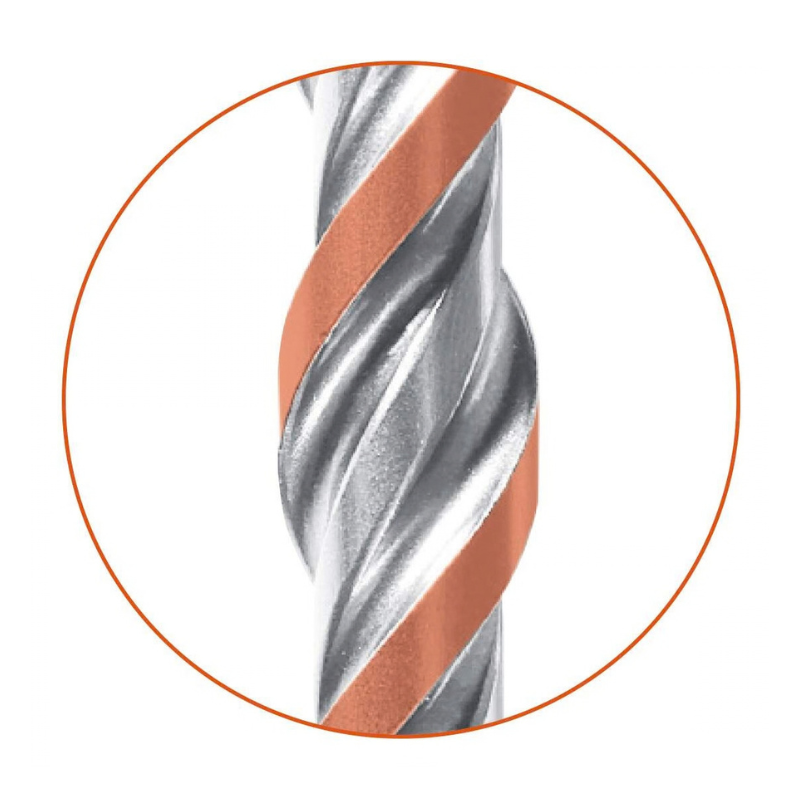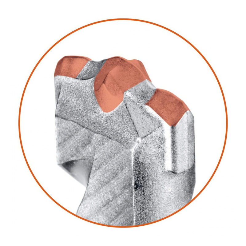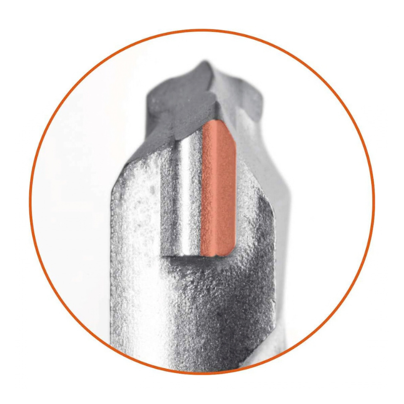 Specjalna konstrukcja z 3 krawędziami kruszącymi (Crusher) wykorzystuje jednocześnie siłę udaru i skręcania, co pozwala na szybkie i skuteczne wiercenie nawet w bardzo twardych materiałach. Dwuskrętna geometria spirali z dużymi zwojami transportowymi zapewnia szybkie odprowadzanie urobku, zmniejszając tarcie i przyspieszając pracę.