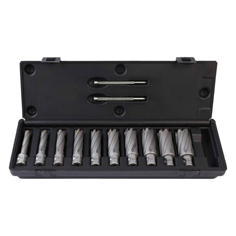 Profesjonalny zestaw wierteł trepanacyjnych (rdzeniowych) WELDON TCT przeznaczony do szybkiego i precyzyjnego wiercenia otworów w metalach. Dzięki zastosowaniu trzech różnych geometrii zębów, które są idealnie dopasowane do siebie, narzędzia zapewniają wysoką wydajność, stabilną pracę oraz bardzo czyste krawędzie otworów.